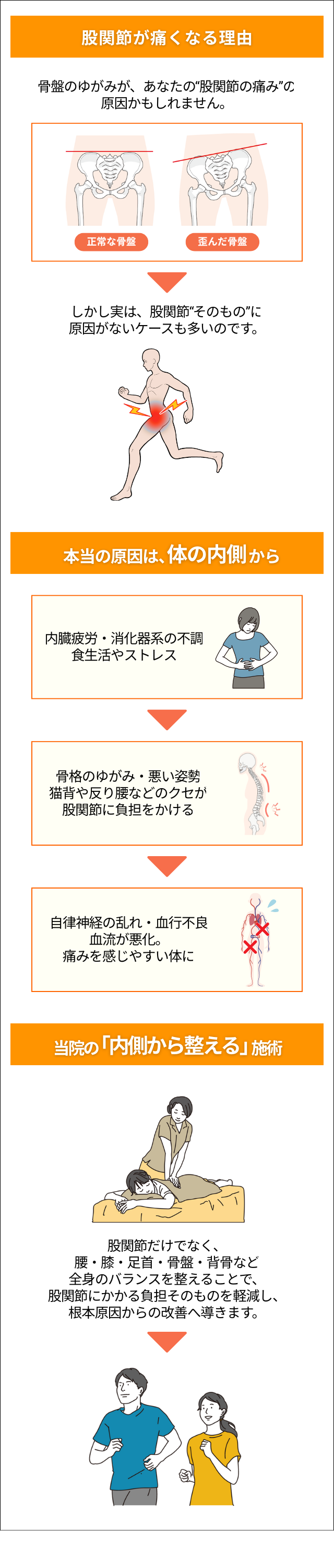 痛みが出ている股関節だけでなく、全身のバランス・循環・自律神経の働きを整えることで、 マッサージや病院で改善しなかった症状も、根本から回復へと導きます。