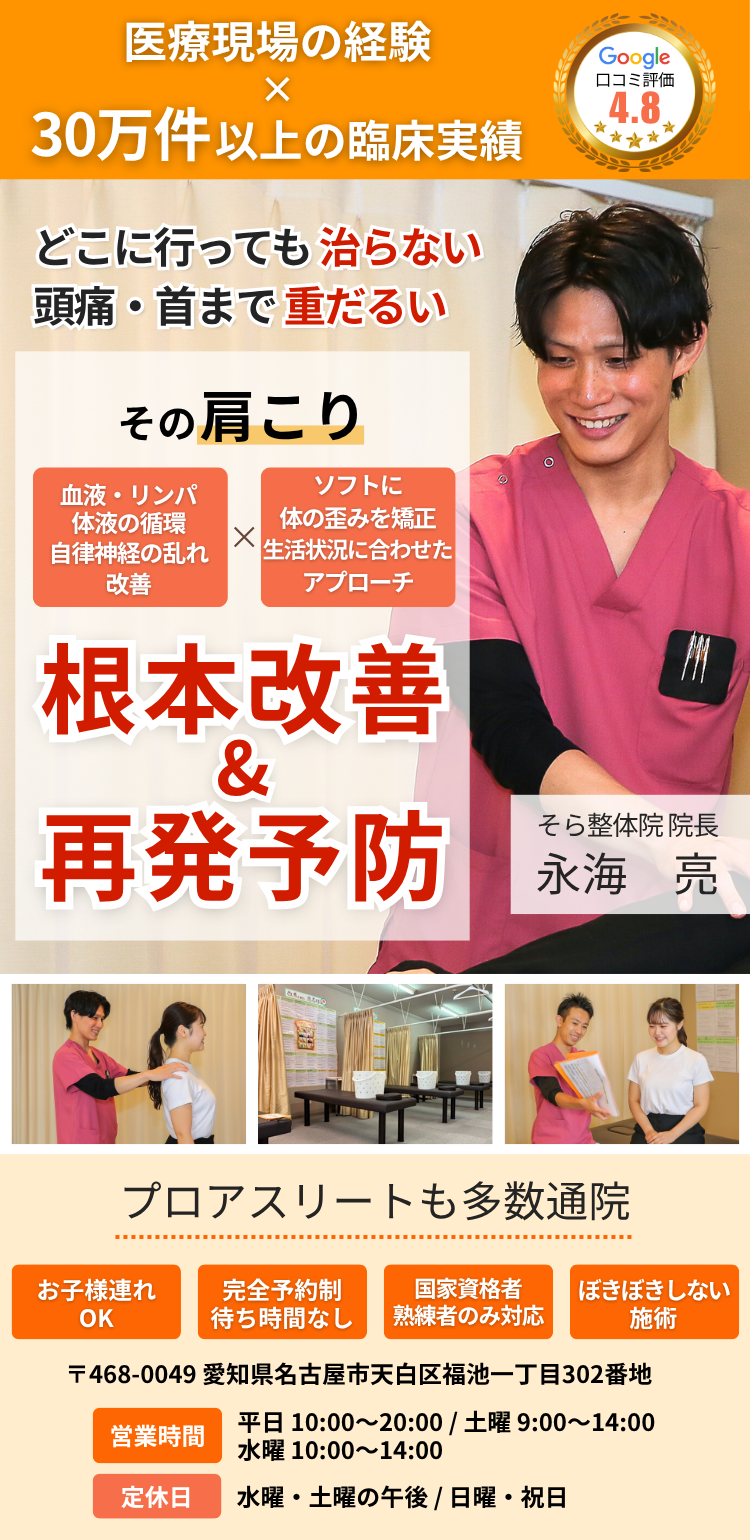 名古屋市天白区のそら整体院では、慢性的な肩こりの根本的な原因は「自律神経の乱れ」「内臓疲労による循環不良」「骨格の歪み」の3つにあると考えています。